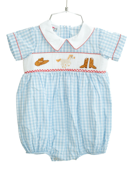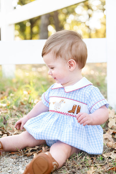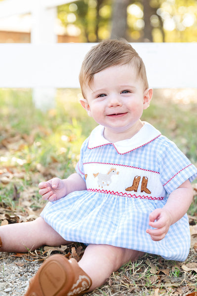 The Smocked Western Bubble is a classic Southern piece made for your little cowboy. Crafted in a timeless blue gingham pattern, this heirloom-style bubble features hand-smocked brown cowboy boots and a western hat and a horse, finished with bold red piping details for a traditional rodeo look. Perfect for rodeos, parties, school events, and Western-themed celebrations, it’s a charming outfit designed for special moments.