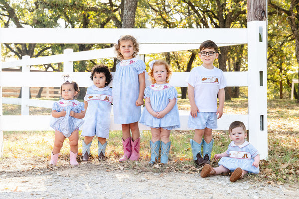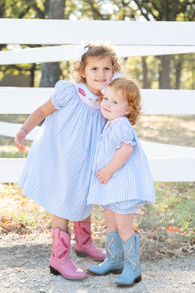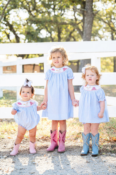 The Smocked Rodeo Western Dress is a timeless Southern favorite made for cowgirls of all ages. Designed in classic blue gingham, this heirloom-quality dress features hand-smocked pink cowgirl boots and hat, paired with a charming horse finished with a pink bow. Sweet yet traditional, it’s perfect for rodeos, school events, parties, and Western-themed celebrations where Southern style shines.