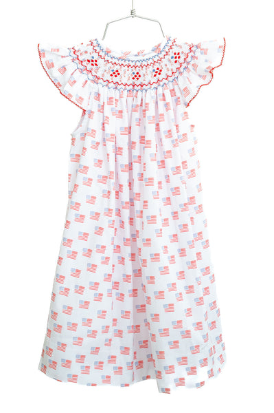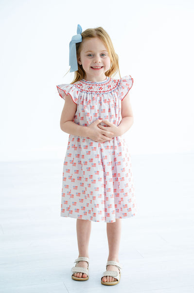 This dress features an all-over American flag print and a hand-smocked patriotic neckline in red, white, and blue. Its classic silhouette and delicate smocking add a timeless Southern touch, perfect for both casual and festive occasions. Ideal for celebrating Fourth of July, Memorial Day, parades, and summer evenings.