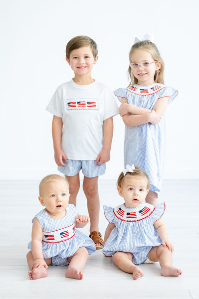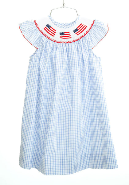 - Sizes: 12M–8 - Fabric: 65% Polyester / 35% Cotton - Blue and white windowpane dress with hand-smocked American flags neckline - Classic, traditional silhouette - Ideal for Memorial Day, Fourth of July, parades, celebrations, and special events - Matching sibling styles available