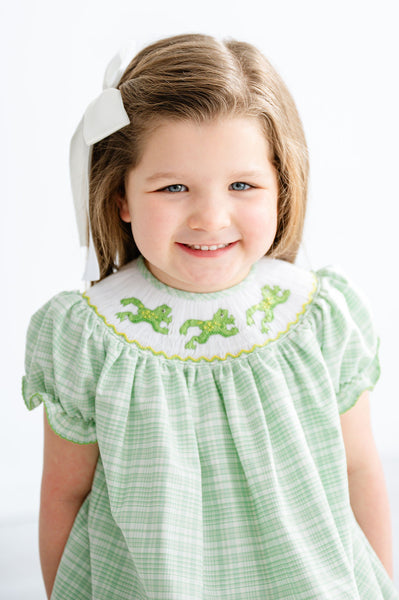 - Green plaid dress with hand-smocked jumping frogs on the neckline
