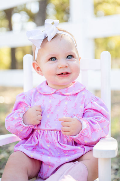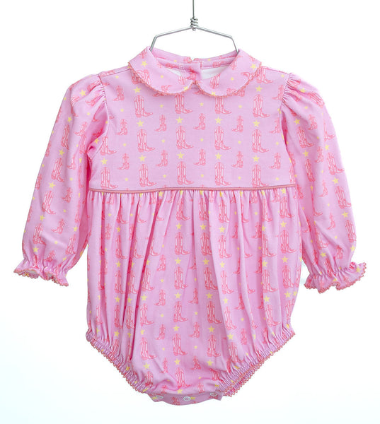 The Boots and Stars Pink Bubble for Girls is a soft, 100% pima cotton long sleeve dress with a fun cowgirl boots and star print. Perfect for rodeos, playdates, photos, and everyday adventures, it’s comfortable, cute, and made for little girls who love to move and play.