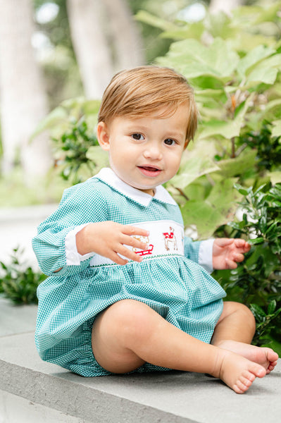 A delightful holiday outfit for your little boy! This long-sleeve Snow Dog bubble is perfect for family gatherings, holiday photos, and creating treasured heirloom memories. Crafted from green gingham fabric (45% polyester / 55% cotton), it features a hand-smocked panel with playful dogs wearing hats and scarves, adding a charming and festive touch.