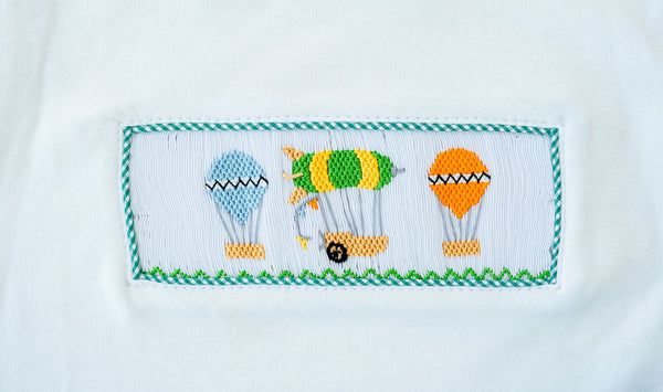 - Smocked panel with hand-smocked hot air balloons