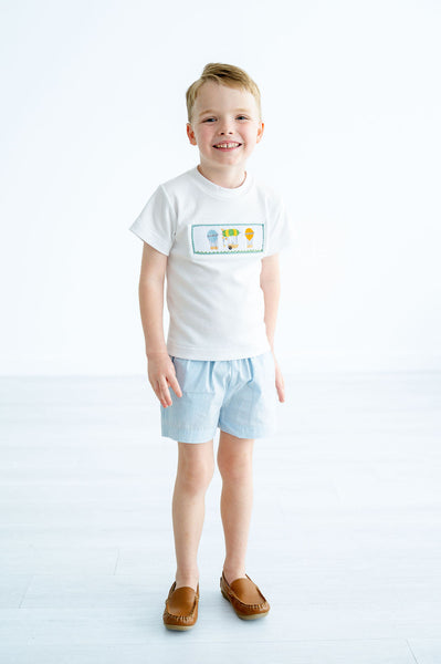 The Smocked Hot Air Balloon T-Shirt and Shorts Set is perfect for toddlers, little boys, and big boys in sizes 12M through 8. The set includes a 100% cotton t-shirt with a smocked panel featuring hand-smocked hot air balloons, paired with blue gingham shorts crafted from a 45% Polyester / 55% Cotton blend. Designed for spring, school events, parties, and celebrations, this set combines classic Southern-inspired style with everyday comfort.