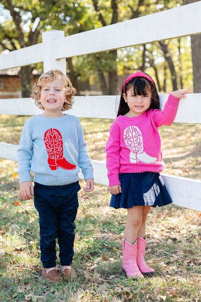 The Pink Cowgirl Boot Sweater is a sweet and festive addition to your little cowgirl’s wardrobe. Made from 100% knit cotton, this soft pink sweater features a white detailed cowgirl boot on the front. Designed for babies, toddlers, and little girls, the fit is true to size and ideal for rodeos, Western-themed days, and special occasions. A charming piece that combines comfort, style, and classic Western flair.