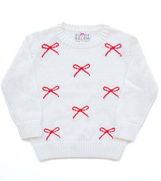 A sweet and festive layering piece for your little girl! This White and Red Bow Sweater is perfect for holiday events, parties, and special family gatherings. Crafted from 100% knit cotton, it fits true to size and pairs beautifully over a Peter Pan collar shirt for a classic, polished look.