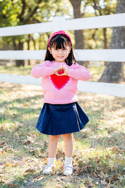 The Pink Heart Sweater is a charming and festive piece for your little one. Made from 100% knit cotton, this light pink sweater features a red heart at the center, accented with delicate pink scalloped detailing. Perfect for layering over a Peter Pan collar shirt, it’s ideal for Valentine’s Day, parties, school events, or other special occasions.