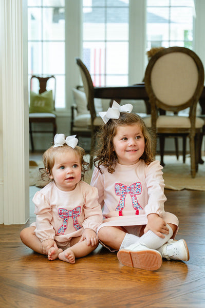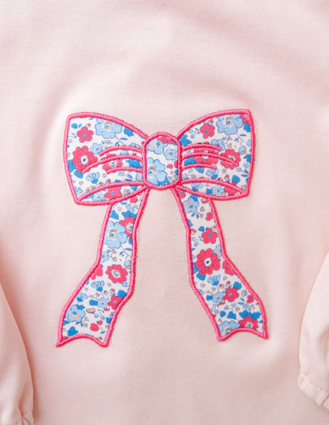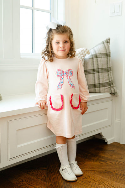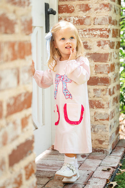 The Pink Floral Bow Appliqué Dress is made from 100% Pima cotton for a soft, comfortable feel she'll love. A floral bow appliqué adds a sweet detail to the front, while deep pink ruffle-trimmed pockets bring both charm and function. Snaps at the back of the neck allow for easy changes.