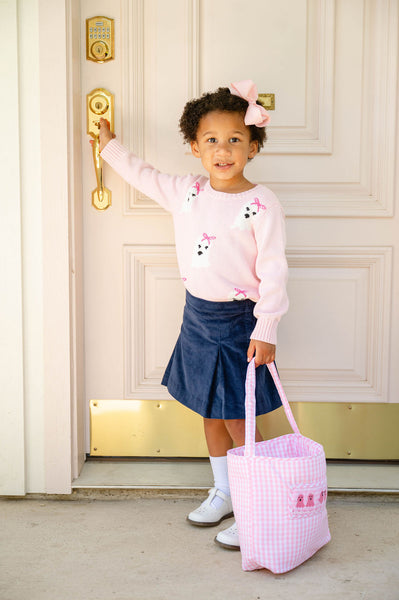 Trick or Treat in style! Our beloved Smocked Ghosts Treat Bags are back in the sweetest light pink check. Hand-smocked with charming little ghosts, this bag is perfect for collecting candy, carrying party favors, or adding a festive touch to your little one’s Halloween outfit. The padded, durable 100% cotton fabric ensures it holds up from the first doorbell ring to the last.