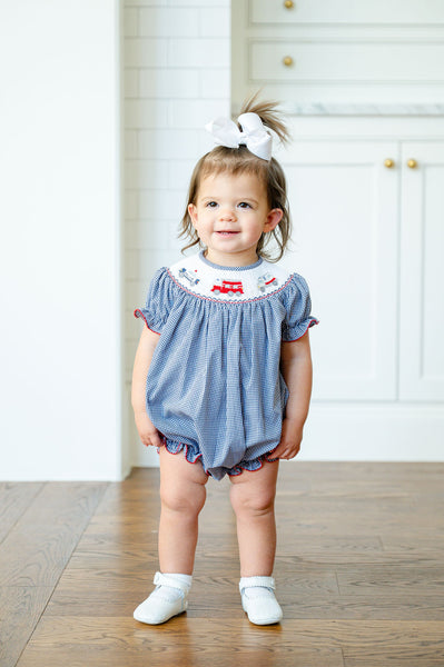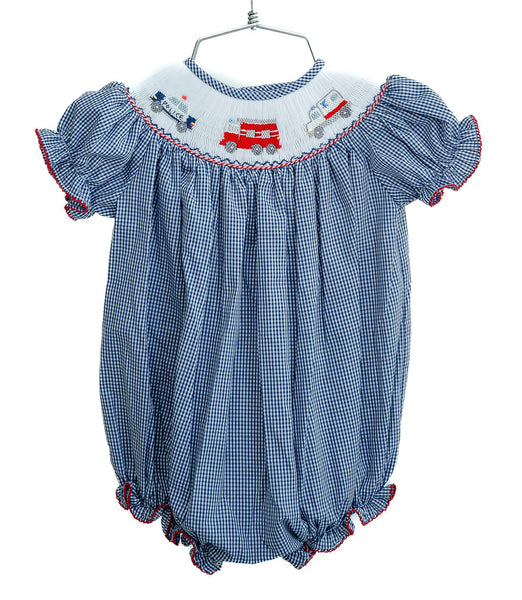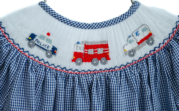 - Navy gingham with hand-smocked fire truck, police car, and ambulance