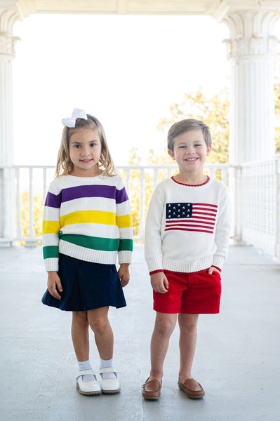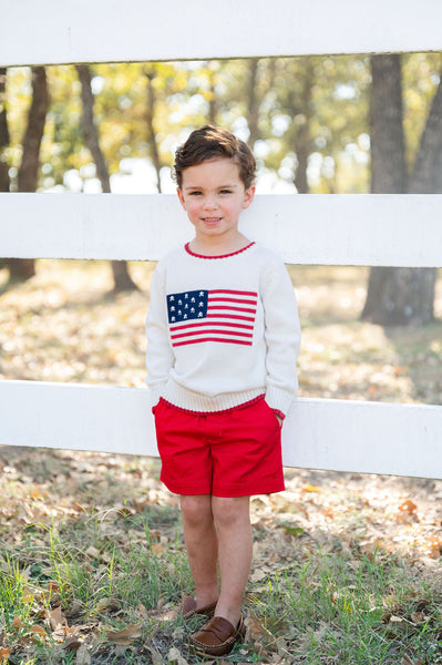 The American Flag Sweater for Kids is a classic, patriotic piece designed for babies, toddlers, and little kids. Made from 100% knit cotton, this soft white sweater features a hand-detailed American flag with a red picot edge, creating a timeless look perfect for Fourth of July, Memorial Day, or any patriotic celebration. Layer it over our Peter Pan collar shirt for added warmth and style.