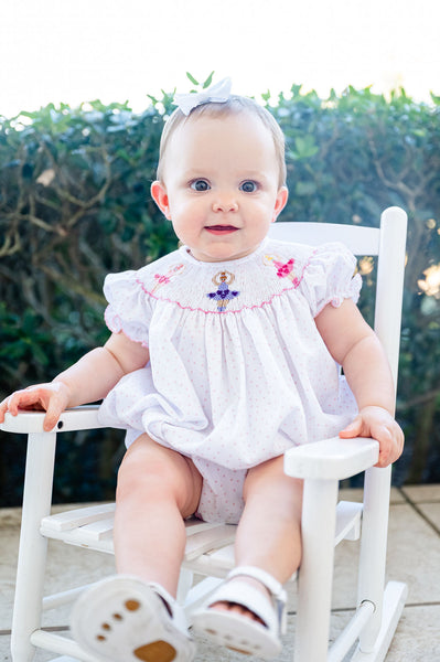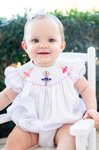 The ballerina smocked bubble features three hand-smocked dancers across a soft white fabric with tiny pink dots. Perfect for babies and toddlers to wear for special events, portraits, holidays, or Valentine’s Day, it also coordinates with the matching smocked dress and bloomer set for sisters.