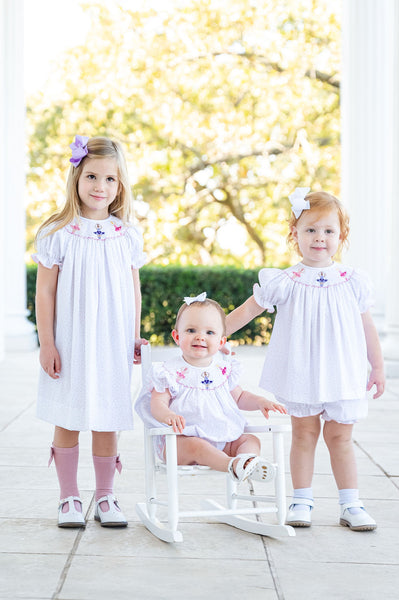 - Coordinates with the matching ballerina smocked dress and bloomer set