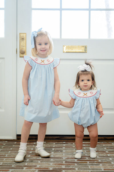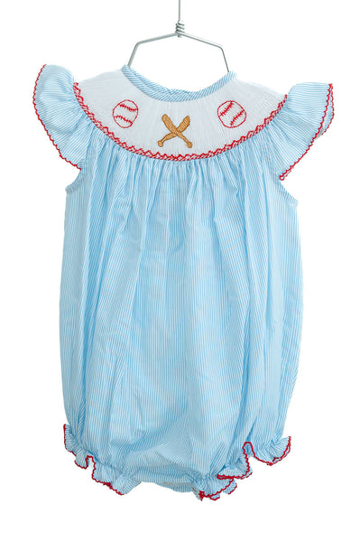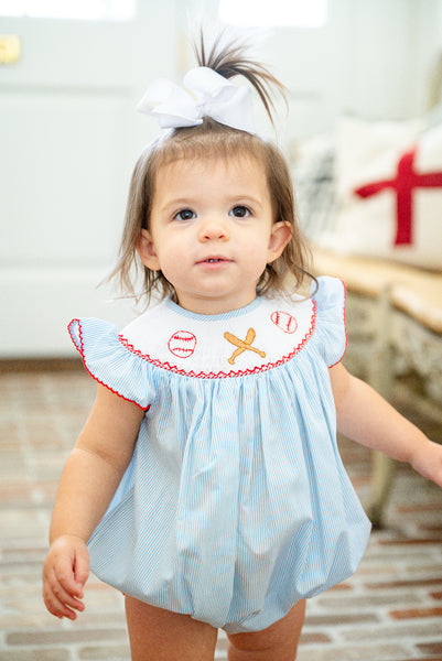 The Smocked Baseball Bubble is an heirloom-quality favorite for baby girls ready to celebrate their first games in timeless style. Made from a soft
