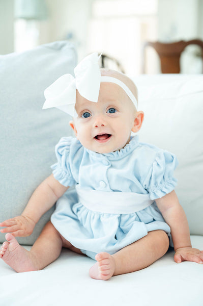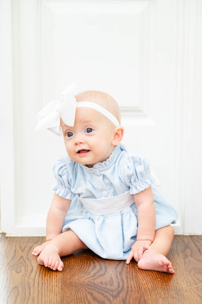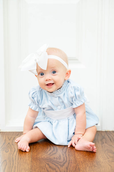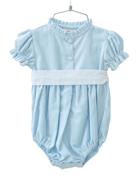 Dress your baby or toddler in classic holiday style with our Blue Velvet Holiday Bubble. Made from luxuriously soft 100% cotton velvet in a light blue shade, this sweet bubble perfectly complements our Blue Velvet Holiday Dress for a coordinating sibling look. Designed especially for little girls, it features a white sash that ties into a beautiful bow at the back and dainty buttons on the front.