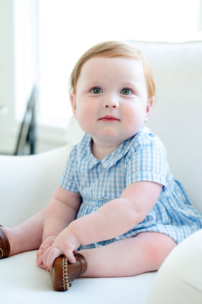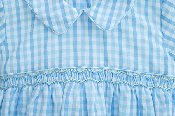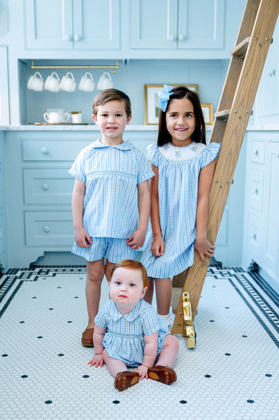 The Blue Gingham Bubble is a classic, heirloom-quality favorite. Made from a soft 45% Polyester / 55% Cotton blend, this sweet bubble features blue gingham fabric, delicate hand-smocking across the chest, and a charming collar. Designed for boys from newborn to 3T, it’s perfect for family photos, springtime outings, or special everyday moments.