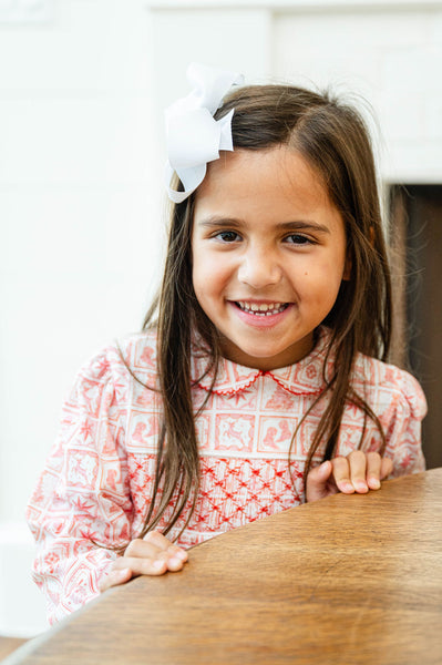 Celebrate the magic of the season! The Pima Smocked Christmas Tile Dress is crafted from soft, 100% Pima cotton and features a festive, Christmas tile print with whimsical cowboy Santas, dancing reindeer, decorated Christmas trees, sparkling Christmas stars, and charming holiday cowboy boots. The beautifully smocked bodice, accented with a delicate picot-edged collar and cuffs, adds a classic, timeless touch, making this dress perfect for family photos, Christmas parties, and special holiday events.