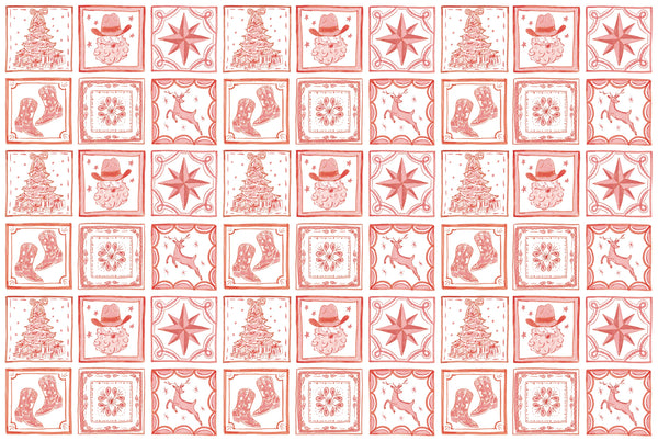 - Festive Christmas tile print with cowboy Santas, reindeer, Christmas trees, stars, and holiday cowboy boots