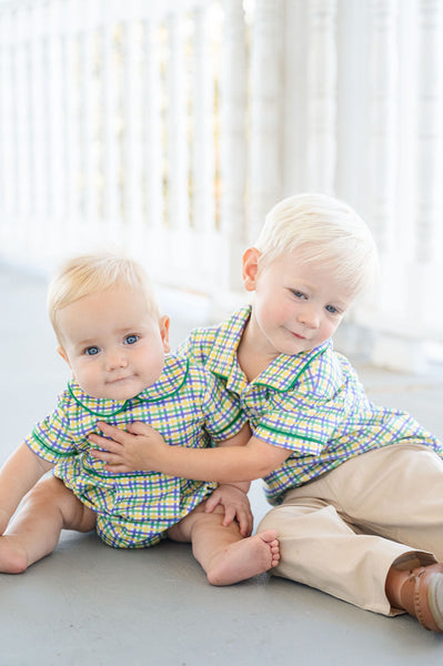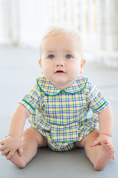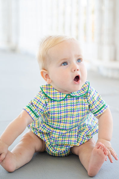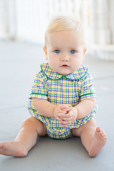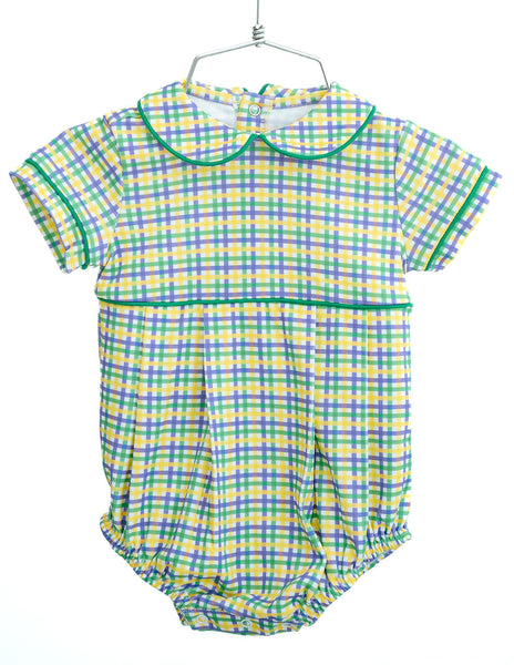 The Mardi Gras Bubble for Boys is a fun and festive outfit made for celebrating. Crafted from 100% Pima cotton, this bubble features a green, yellow, and purple plaid with green piping for a classic Mardi Gras look. Designed for babies and toddlers, it’s an easy choice for parades, celebrations, parties, and all the excitement that comes with Mardi Gras season.