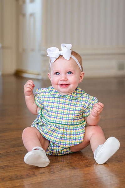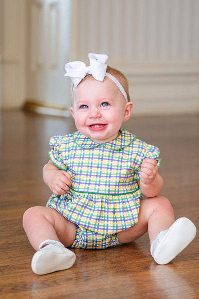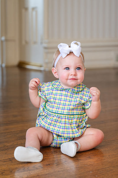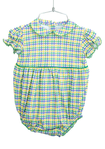 Bring festive fun to your little one’s wardrobe with the Mardi Gras Bubble, crafted from soft 100% Pima cotton for comfort and lasting quality. Made in a playful green, yellow, and purple plaid with green piping, this bubble is perfect for parades, parties, and special Mardi Gras events. Layer it with our Mardi Gras sweater for cooler days.