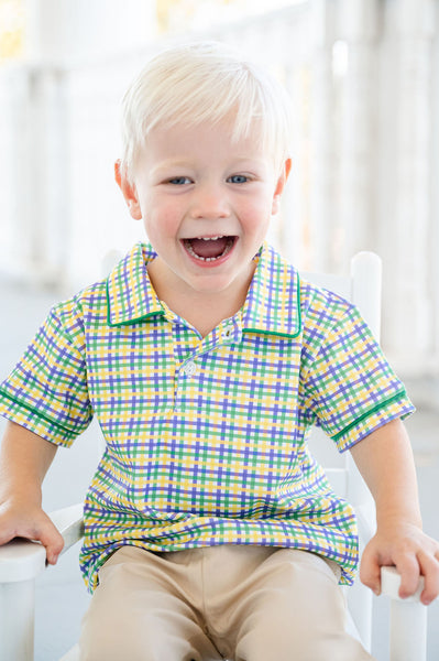 The Mardi Gras Polo for Boys is a festive staple for the season. Made from 100% Pima cotton, this classic polo features a green, yellow, and purple plaid with green piping for a classic Mardi Gras look. Easy to dress up or wear casually, it’s perfect for parades, parties, school events, and holiday gatherings.