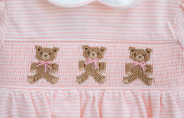 Adorable Teddy Bear smocking on soft light pink striped pima cotton fabric. Its charming design adds a sweet touch to cuddle time.