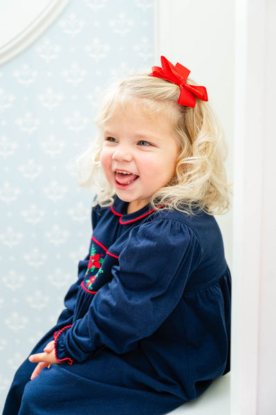 Make holiday memories even sweeter with our Smocked Pima Poinsettia Dress. Crafted from luxuriously soft 100% Pima cotton, this timeless navy dress features delicate hand-smocked poinsettia flowers across the chest and festive red piping at the collar. The long sleeves and classic silhouette give this piece an heirloom feel, perfect for passing down through the years.