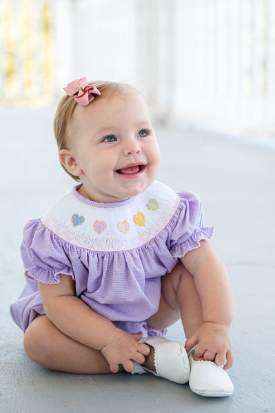 The Smocked Rainbow Hearts Bubble is a timeless, heirloom-quality style for your sweetest little Valentine. Made from a soft 45% Polyester / 55% Cotton blend, this precious bubble features a purple micro gingham fabric with smocked pastel rainbow hearts in shades of blue, purple, pink, yellow, and green. Perfect for Valentine’s Day, photos, parties, and special events, it’s a classic keepsake piece you’ll love for years to come.