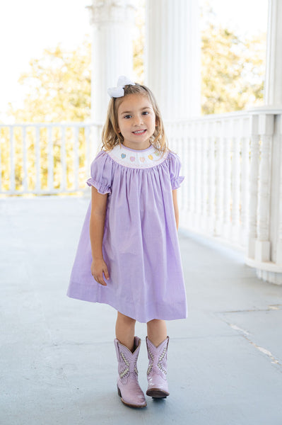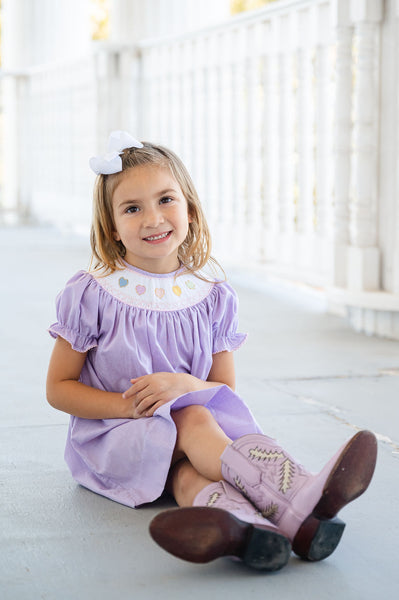 The Smocked Rainbow Hearts Dress is a classic, heirloom-quality style perfect for Valentine’s Day. Made from a soft 45% Polyester / 55% Cotton blend, this sweet dress features a purple micro gingham with beautifully smocked pastel rainbow hearts in shades of blue, purple, pink, yellow, and green. The timeless silhouette makes it a lovely choice for daddy–daughter dances, parties, church, photos, and special celebrations.