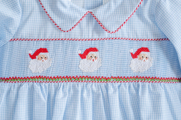 A classic holiday look for your littlest boy! This long-sleeve smocked Blue Santa bubble is perfect for Christmas parties, Santa photos, and festive family gatherings. Made from soft blue gingham (45% polyester / 55% cotton), it features a hand-smocked panel of cheerful Santas across the chest and gentle elastic at the legs for a comfortable, traditional fit.