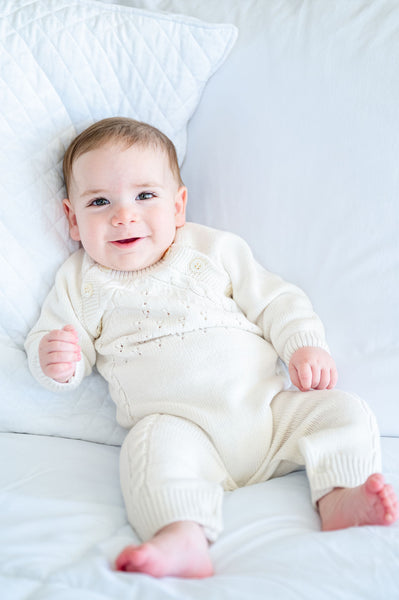 The White Cashmere-Blend Coming Home Outfit is a timeless, neutral staple for your newborn’s earliest moments. Made from a luxurious 95% cotton / 5% cashmere blend, this soft knit romper features a classic ivory hue with delicate knit detailing and button accents. Perfect for the hospital trip home, baby photos, and meeting family for the very first time.