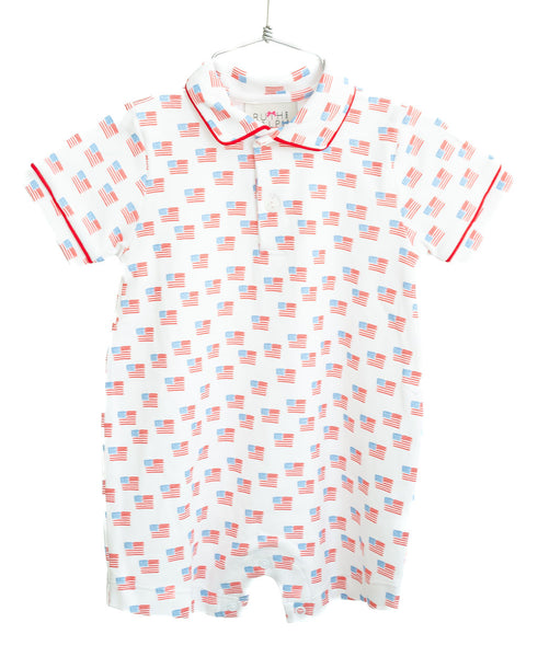 The Pima American Flag Romper is a classic one-piece style for baby and toddler boys, available in sizes 9M through 4T. Made from 100% Pima cotton, it’s soft, lightweight, and comfortable for all-day wear.