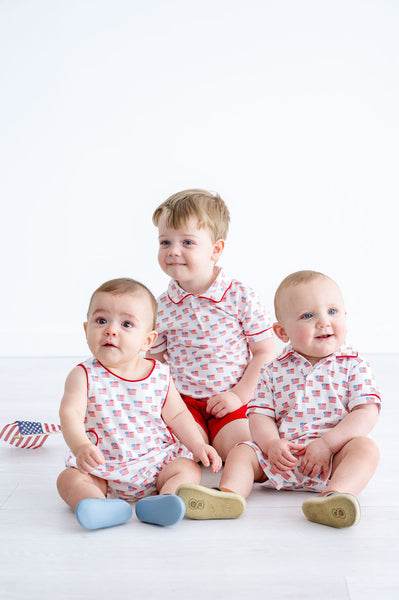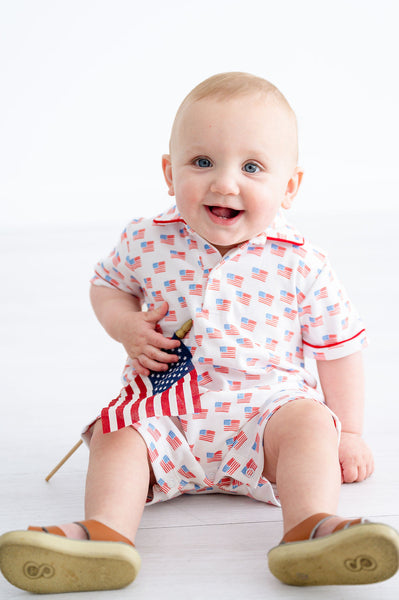 Featuring an all-over American flag print with red details, this romper has a clean, traditional look with an easy fit for movement and play. Perfect for coordinating with siblings, this style is part of a matching set for a pulled-together look for Memorial Day, Fourth of July, parades, and backyard cookouts.