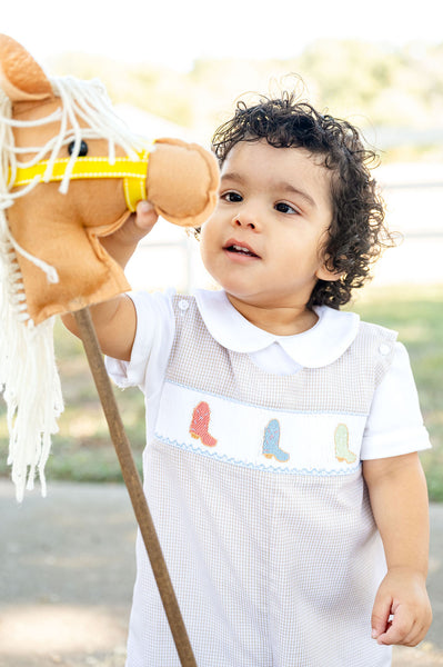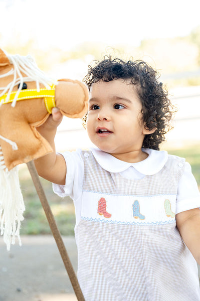 The Smocked Cowboy Boots JonJon for Baby and Toddler Boys is a charming tan gingham outfit with smocked cowboy boots in red, blue, and green. Perfect for little cowboys, rodeos, and special events, this heirloom-quality jonjon combines classic southern style with comfort and charm. Designed for babies and toddlers ages 3M–4T, it pairs beautifully with our Peter Pan collar shirt for a complete, timeless look.