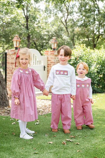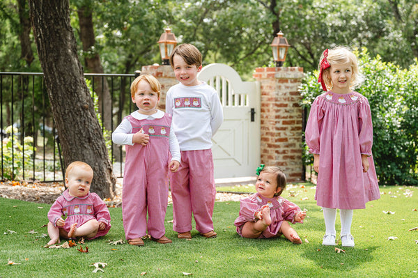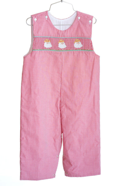 Celebrate the season with a festive southern touch! This smocked cowboy Santa longall for baby and toddler boys is a holiday standout, perfect for Christmas parties, family gatherings, and cherished holiday photos. Crafted in classic red gingham (45% polyester / 55% cotton), the longall features a hand-smocked panel of cheerful Santas in cowboy hats across the chest. Pair it with a pan collar shirt for a timeless holiday outfit.