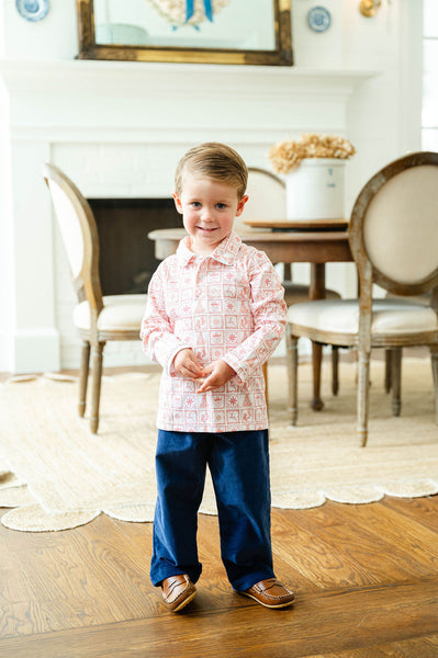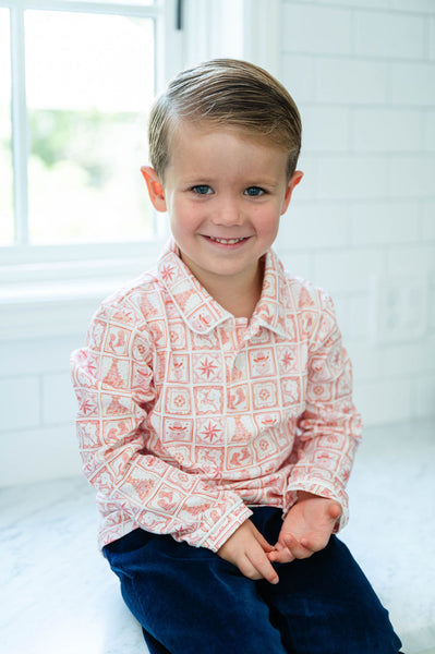 Celebrate the holidays in style! The Pima Christmas Tile Polo is crafted from soft, 100% Pima cotton and features a festive, Christmas tile print with whimsical holiday motifs like cowboy Santas, reindeer, Christmas trees, sparkling stars, and holiday boots. The long-sleeve polo offers a polished, timeless look, perfect for family photos, holiday parties, or special outings. Add a monogram for a personalized touch that makes this holiday favorite truly one-of-a-kind.